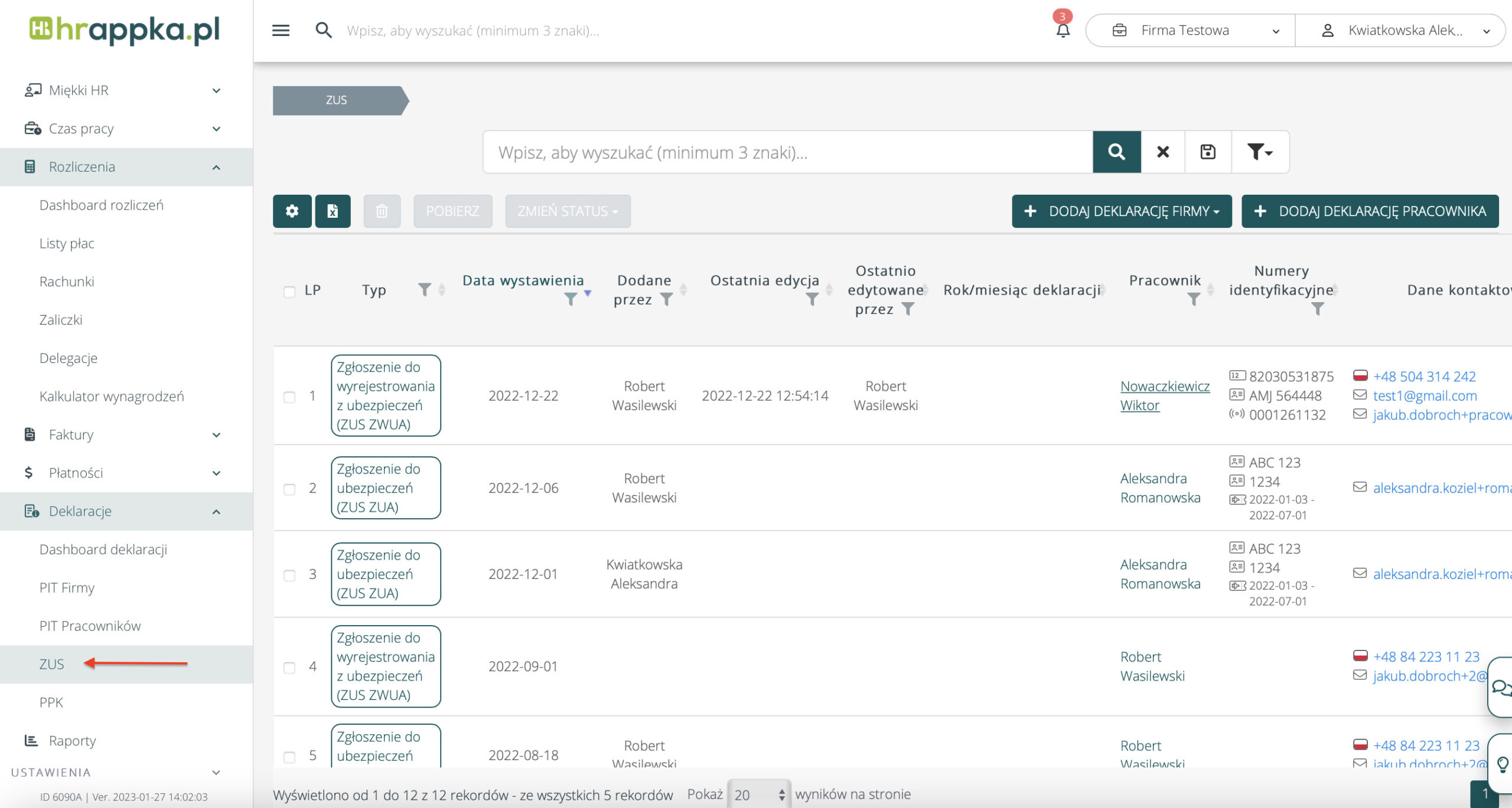 Deklaracje ZUS możesz znaleźć zarówno na profilu pracownika jak i na liście deklaracji ZUS:
