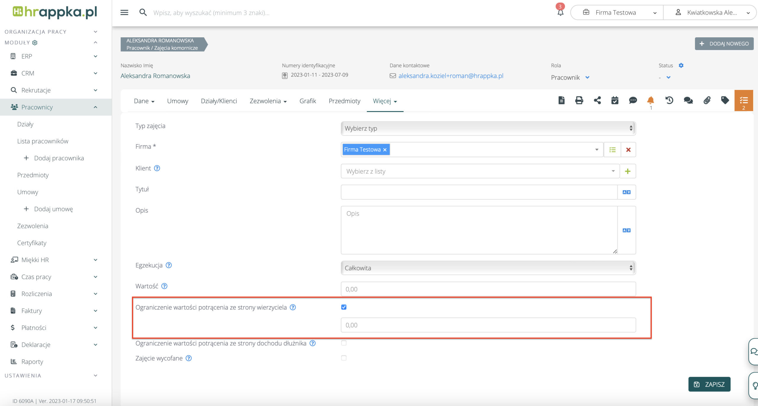 Aby zaznaczyć ograniczenie wartości potrącenia na zajęciu komorniczym należy przejść do Pracownicy > Lista Pracowników > Dany pracownik > Więcej > Zajęcia komornicze > Wybrane zajęcie komornicze.