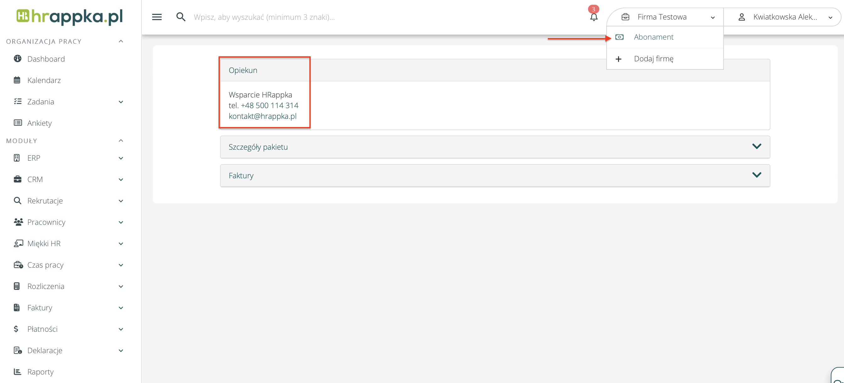 W tym celu skontaktuj się z Twoim Opiekunem (jego dane znajdziesz w Menu firmy (należy kliknąć na nazwę firmy w prawym górnym roku) > Abonament) lub ze Wsparciem systemu HRappka – tel. 500 114 314, email: kontakt@hrappka.pl.