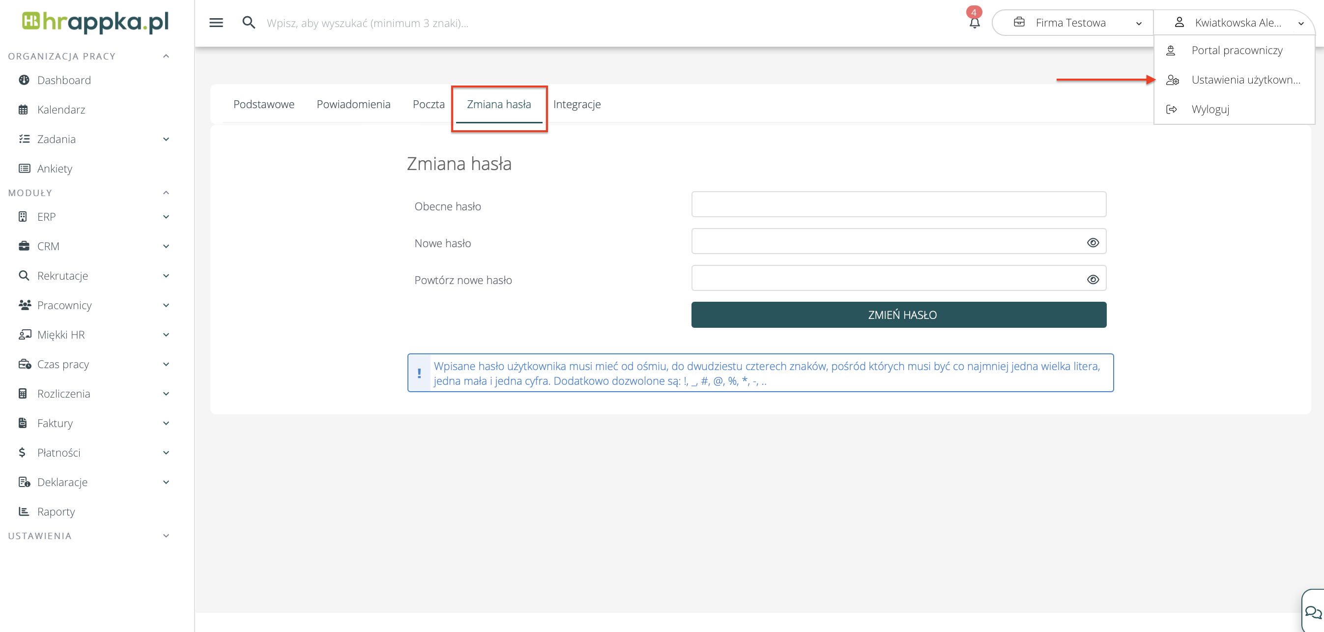 Po zalogowaniu się do systemu należy przejść do ustawień własnych (trzy zębatki w prawym górnym rogu ekranu, pod nazwiskiem użytkownika). Następnie w zakładce „zmiana hasła” jest możliwość ustawienia nowego.