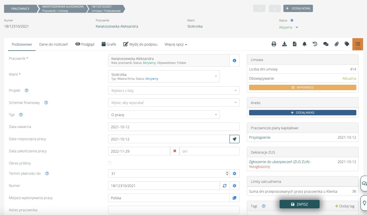 Na profilu pracownika, w zakładce Umowy, po wybraniu Umowy, w sekcji Aneks po prawej stronie należy wybrać „Dodaj aneks”.