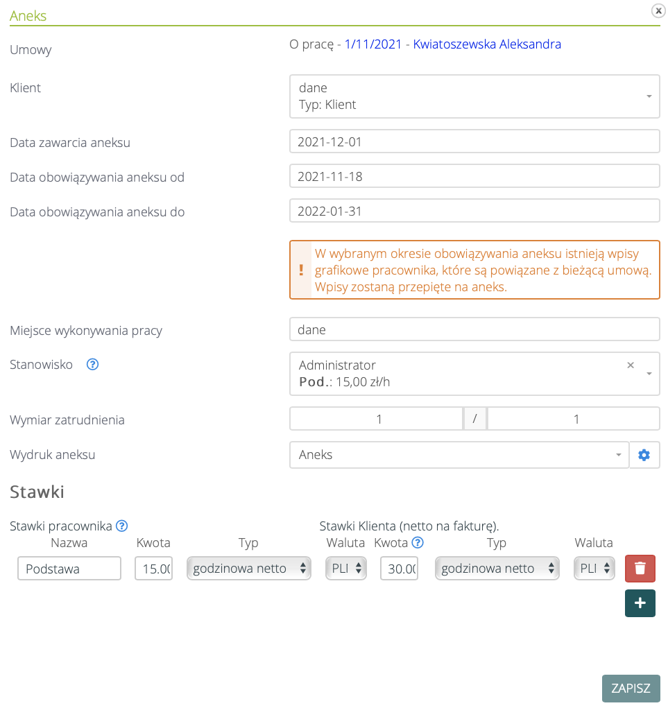 Następnie należy uzupełnić datę zawarcia aneksu, data obowiązywania aneksu od i data obowiązywania aneksu do oraz pozostałe dane.