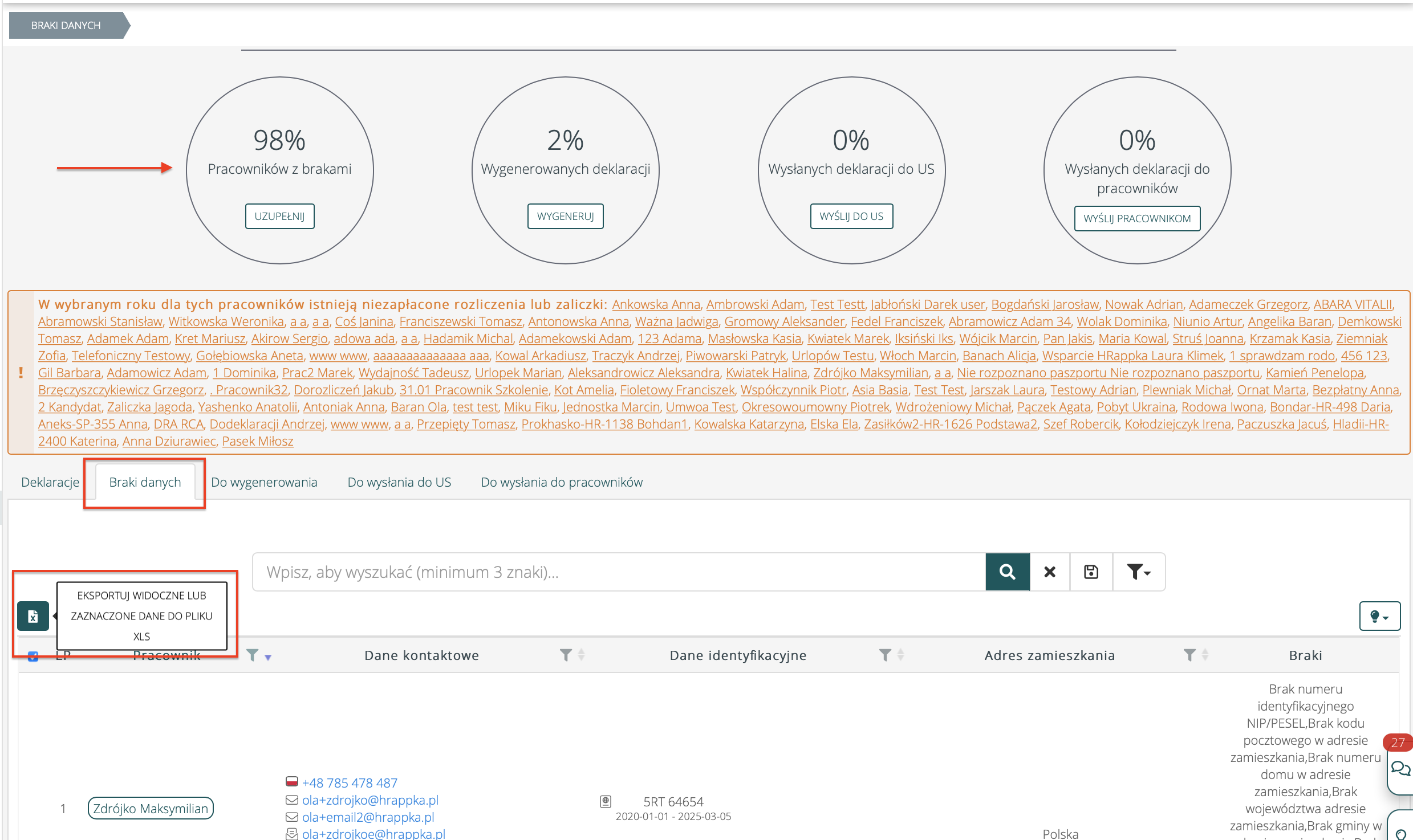 W kolumnie „Braki", znajdziesz szczegółowe informacje, jakich danych brakuje, aby wystawić pracownikowi deklaracje. Przejdź do profilu pracownika (np. klikając na jego imię i nazwisko) i uzupełnij brakujące dane.