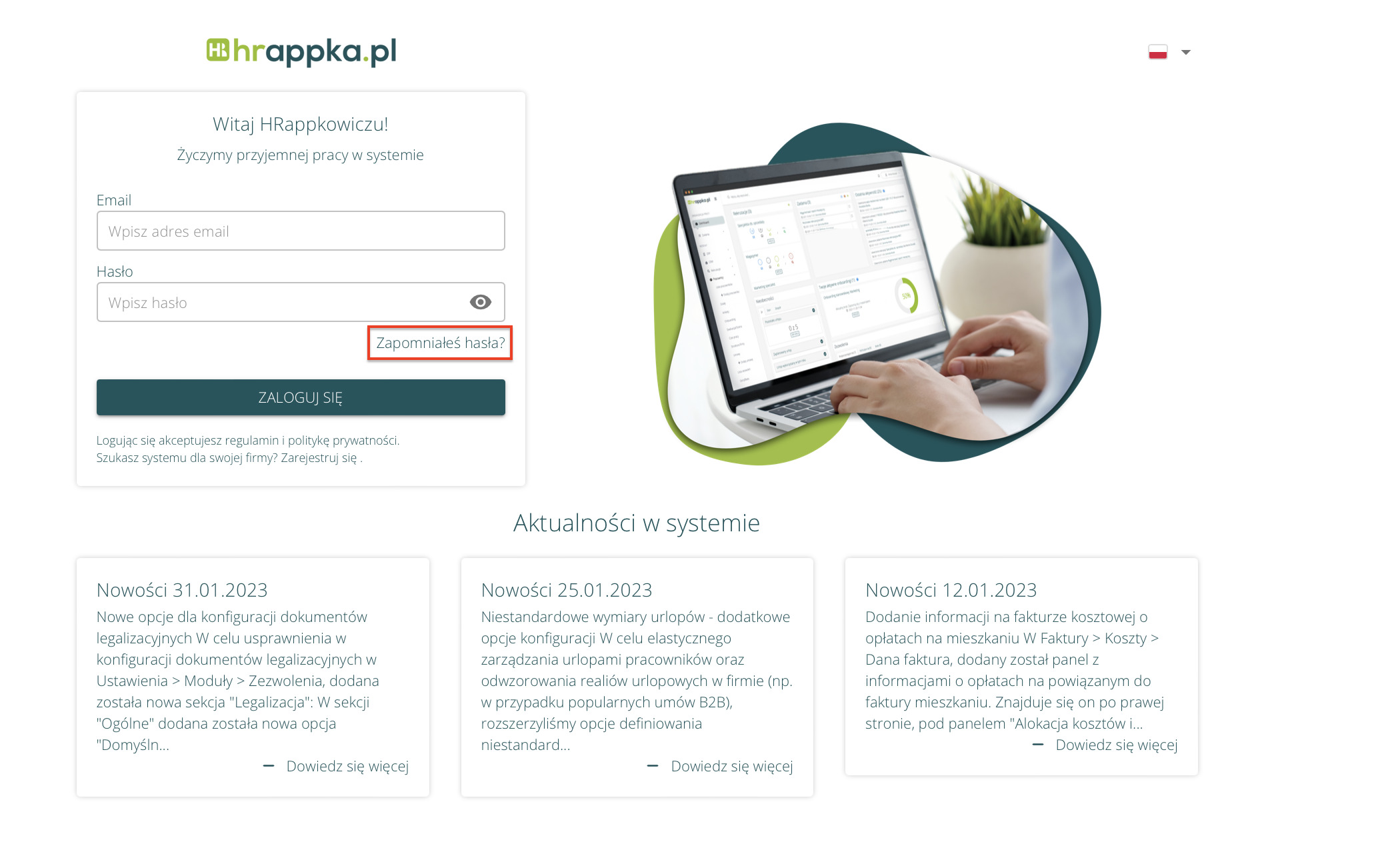 Aby zresetować hasło w systemie należy przejść do okna logowania i kliknąć na nazwę „Zapomniałeś hasła?”. Następnie należy wpisać adres email użytkownika i przycisk „Resetuj hasło”.