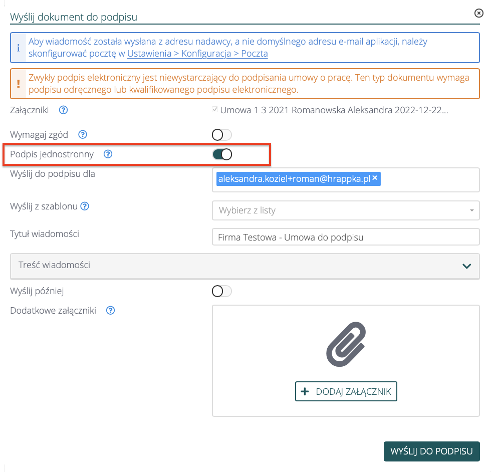 Podpis jednostronny można włączyć podczas wysyłania załączników do podpisu elektronicznego, korzystając z opcji „Podpis jednostronny”. Gdy pracownik podpisze dokument, karta podpisów będzie zawierała jedynie podpis pracownika.