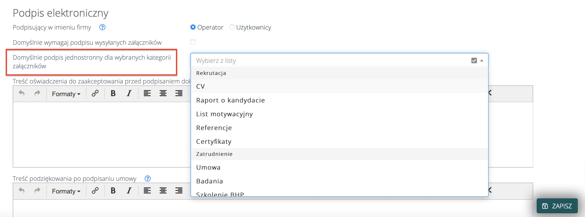 W Ustawienia > Moduły > Pracownicy > Podpis elektroniczny możemy zdefiniować typy załączników, dla których domyślnie będzie włączany jednostronny podpis elektroniczny: