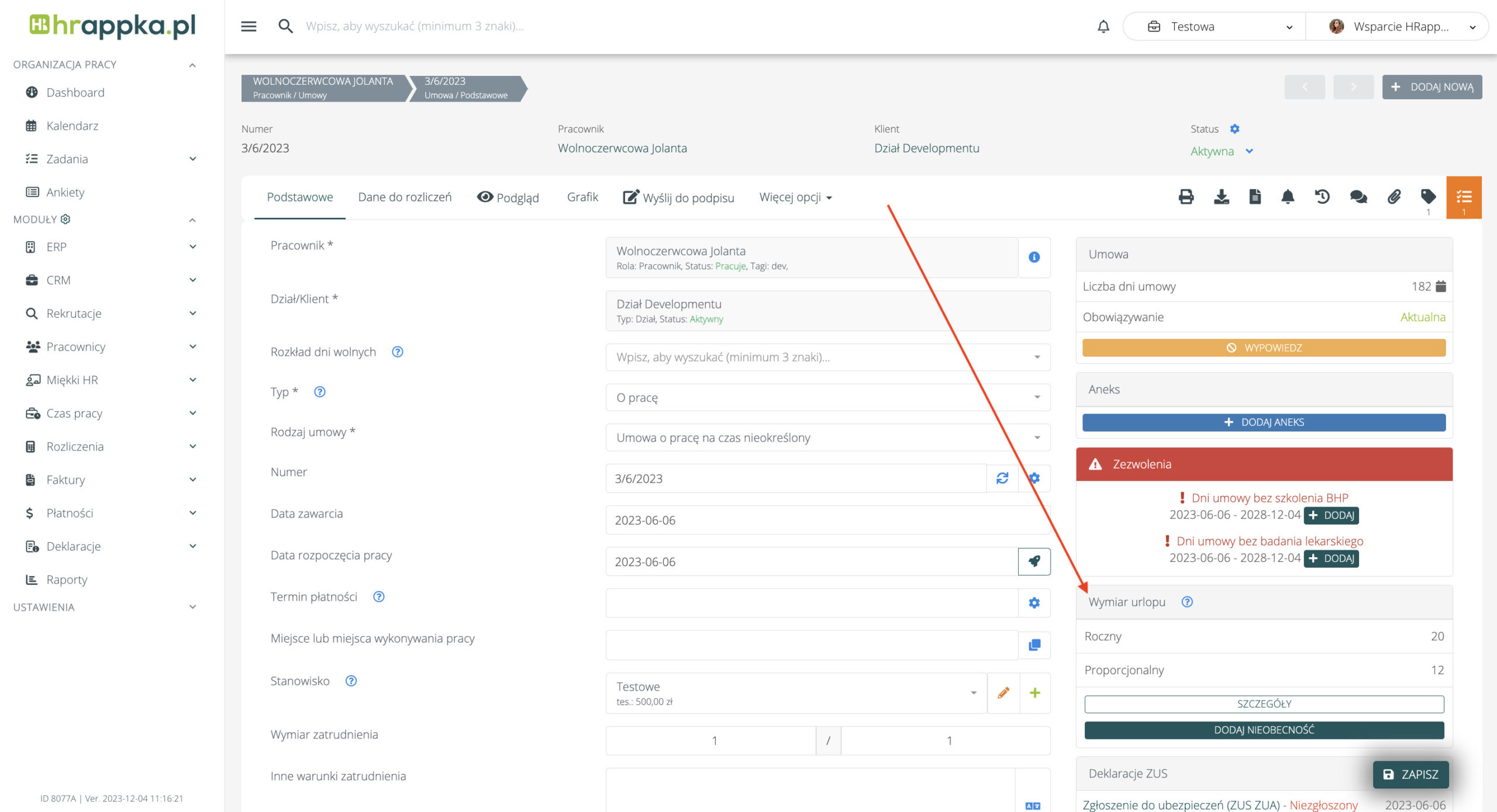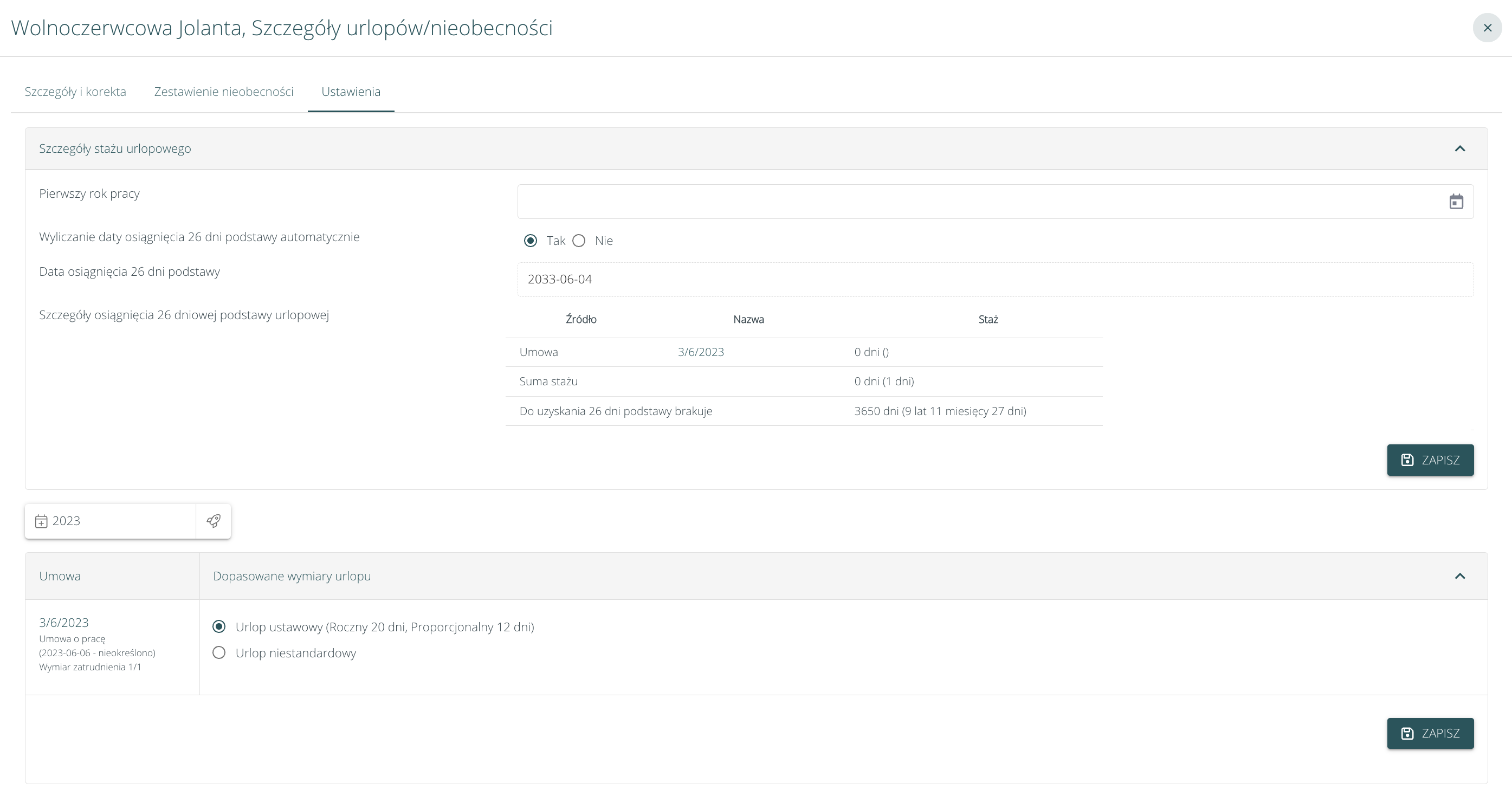 - na umowie pracownika w sekcji Wymiar urlopu: