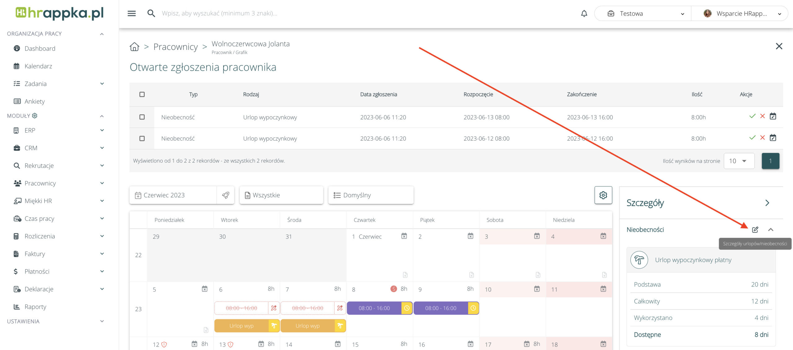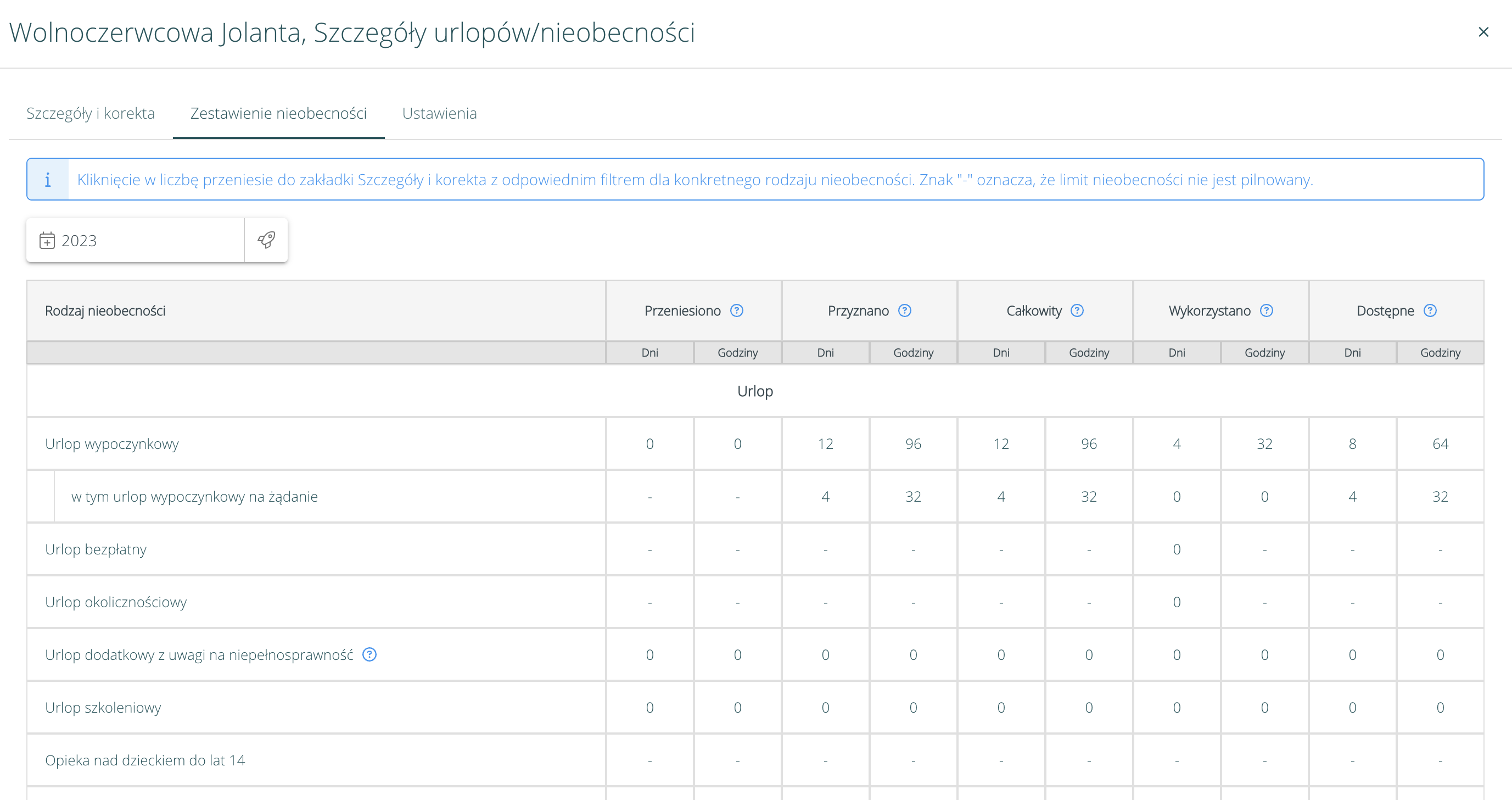 Kliknięcie na liczbę w wybranej komórce, przeniesie nas do szczegółów tej nieobecności i operacji.