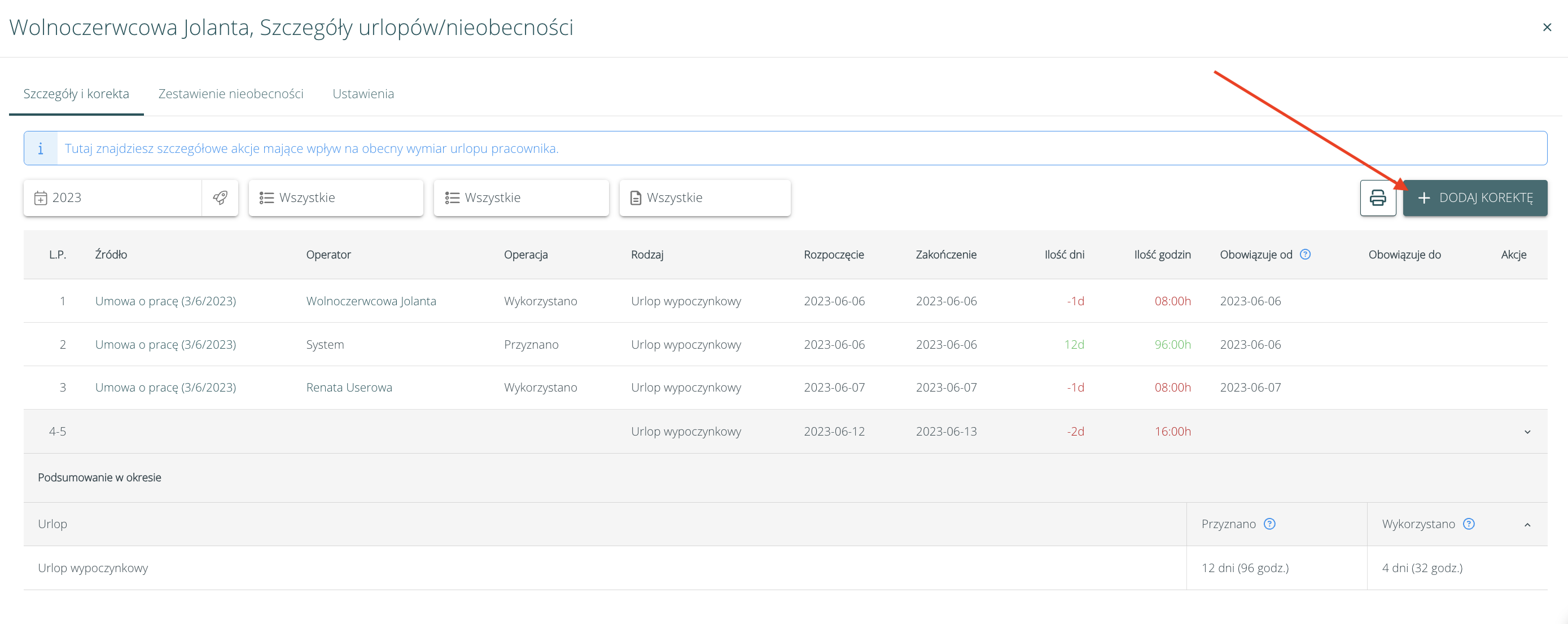 Istnieje również możliwość korekty nieobecności (czyli dodania lub odjęcia nieobecności o wybranym typie), klikając w przycisk „Dodaj korektę”, który znajduje się nad listą:
