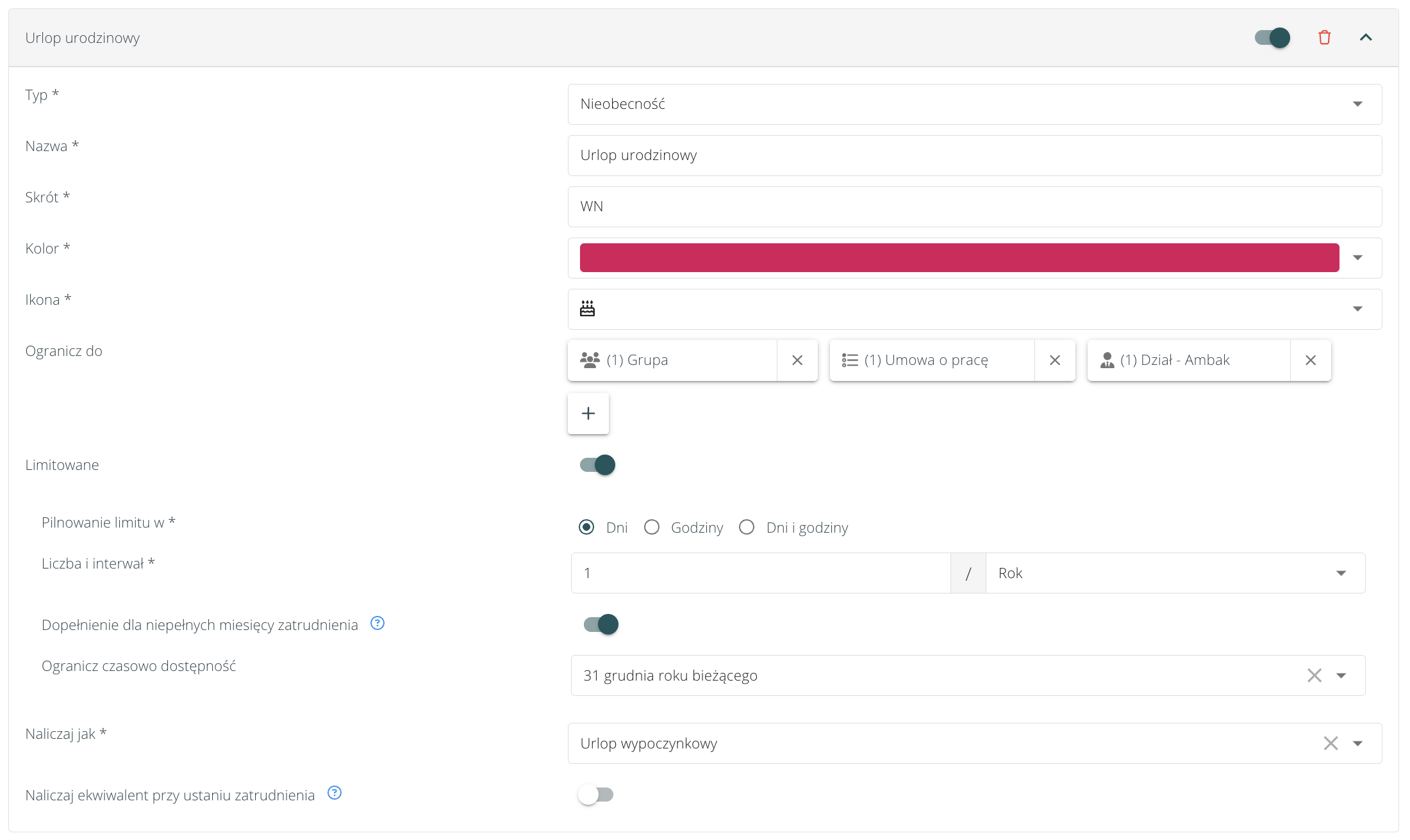 - Własnych rodzajach nieobecności (np. Urlop niestandardowy, urlop urodzinowy) – czyli wymiarze urlopu skonfigurowanym domyślnie w ustawieniach firmy. Urlop niestandardowy można definiować w Ustawieniach firmy > Moduły > Pracownicy > Własne rodzaje nieobecności i pracy, dla każdego typu umowy, zarówno umowy o pracę, jak i B2B. Pozwala to nadpisać wymiar urlopu, danymi w urlopie niestandardowym (np. jeżeli umowa zlecenie nie ma urlopu kodeksowego, możemy dodać własny rodzaj nieobecności dla osób z tym typem umowy – wtedy podczas wystawiania takiej umowy pracownikowi automatycznie zostanie przypisany dodany rodzaj nieobecności). Szczegóły dot. konfiguracji własnych rodzajów nieobecności znajdują się tutaj.