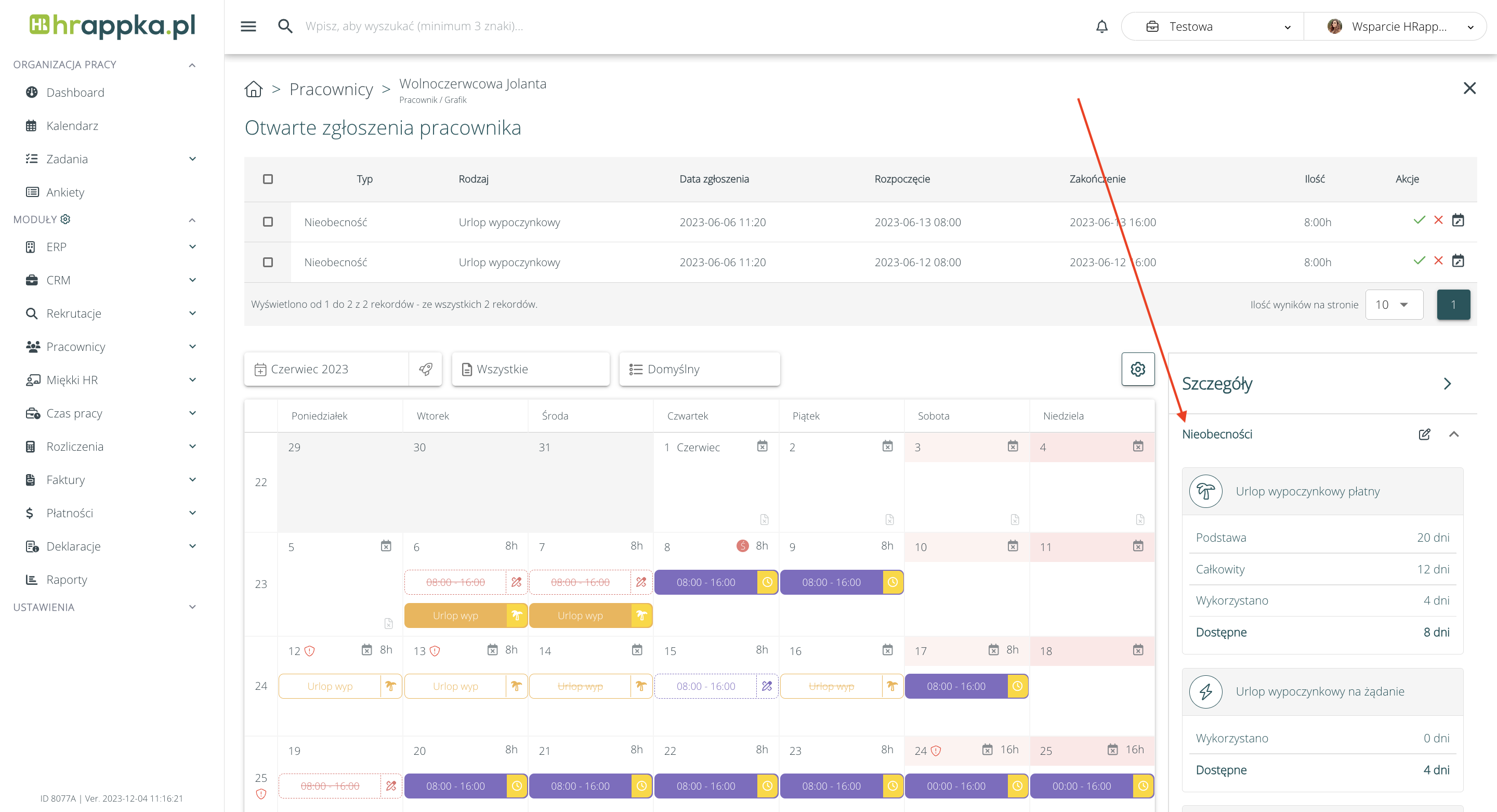 Kliknięcie na liczbę w wybranej komórce, przeniesie nas do szczegółów tej nieobecności i operacji.