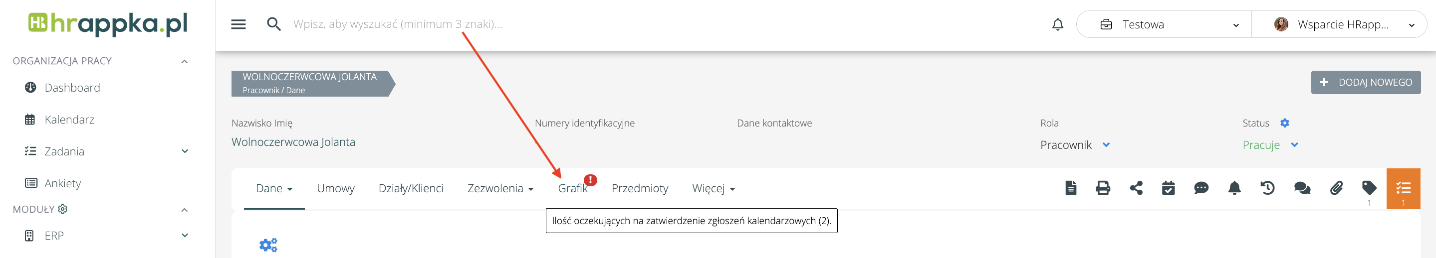 - na profilu pracownika w sekcji Grafik: