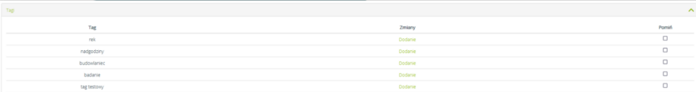 - Opcja „Tagi” – przenoszone są wszystkie utworzone tagi w Ustawienia firmy > Zaawansowane > Tagi
