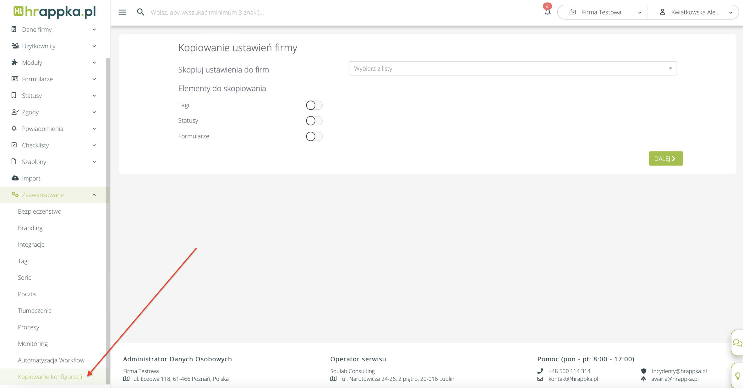 Kopiowania ustawień z jednej firmy na pozostałe dostępne jest w Ustawienia > Zaawansowane > Kopiowanie konfiguracji.