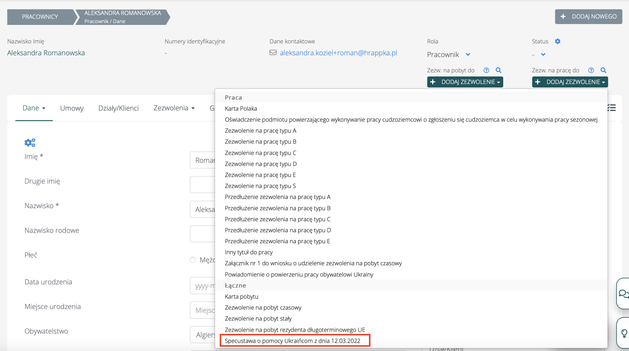 - Na potrzeby systemowe (w celu uzyskania informacji, które osoby mogą skorzystać z warunków specustawy) dodaliśmy zezwolenie „Specustawa o pomocy Ukraińcom z dnia 12.03.2022” . Dotyczy ona wszystkich obywateli Ukrainy oraz ich małżonków nieposiadających obywatelstwa ukraińskiego. Dostają oni możliwość zatrudnienia na podstawie Powiadomienia o powierzeniu wykonywania pracy obywatelowi Ukrainy, a osoby które przybyły po 24.02.2022 do Polski: