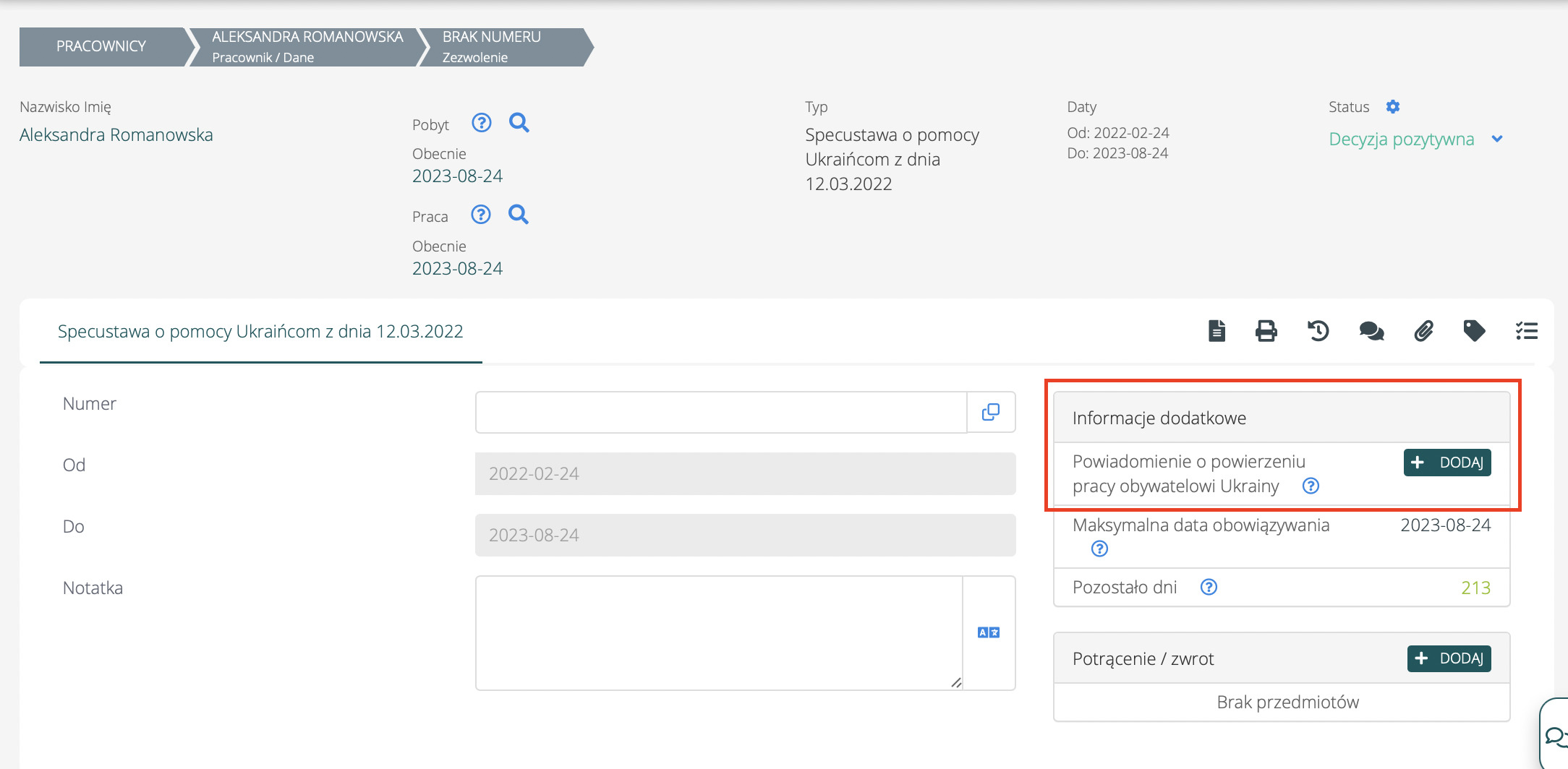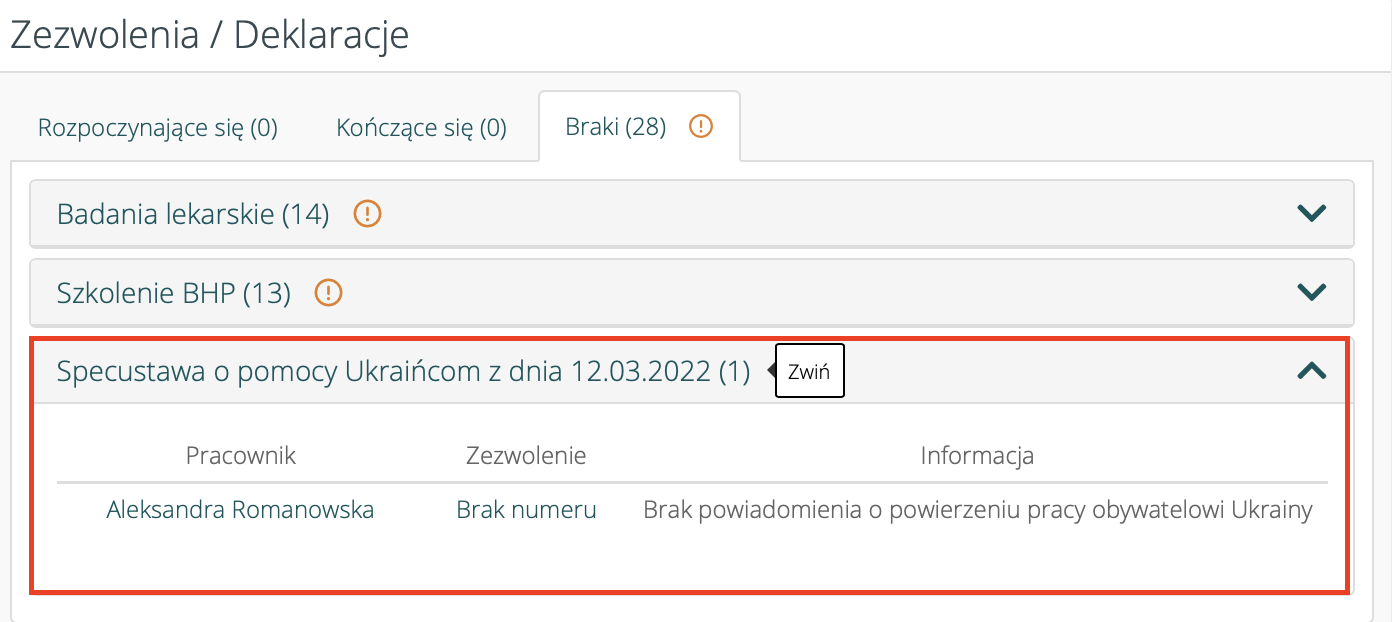 - Na dashboardzie w widgecie zezwoleń listowane są osoby, które posiadają zezwolenie „Specustawa o pomocy Ukraińcom z dnia 12.03.2022” oraz umowę, ale nie posiadają „Powiadomienia o powierzeniu wykonywania pracy obywatelowi Ukrainy zgodnie ze specustawą” – w terminie 14 dni od rozpoczęcia pracy