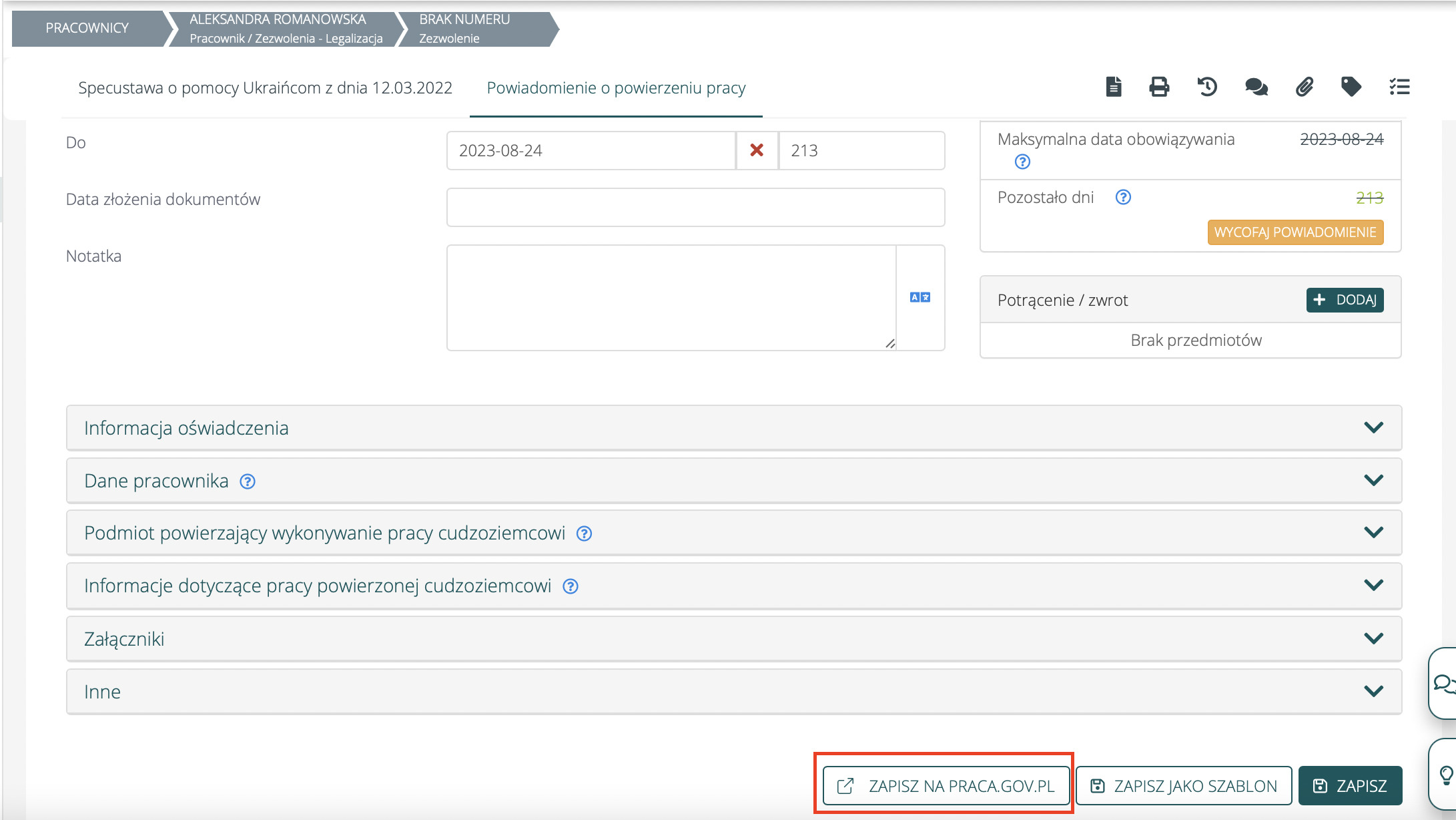 - Dodanie „Powiadomienia o powierzeniu wykonywania pracy obywatelowi Ukrainy zgodnie ze specustawą” – na podstawie daty wysyłki do urzędu na www.praca.gov.pl: