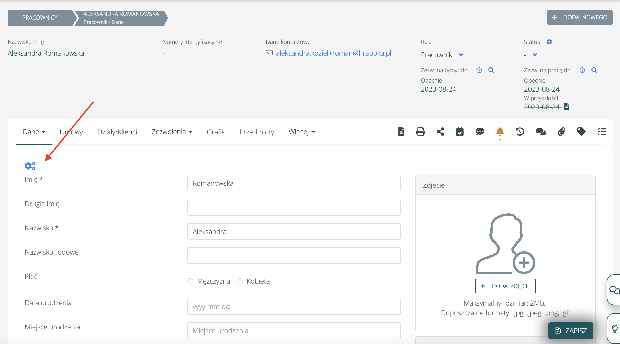 Podczas uzupełniania danych pracownika, dodana została możliwość wstawienia pól : „Dokument tożsamości cudzoziemca", „Tymczasowe zaświadczenie tożsamości" i „Seria i numer tymczasowego dowodu". Aby pojawiały się one w formularzu, należy kliknąć w zębatkę w lewym górnym rogu: