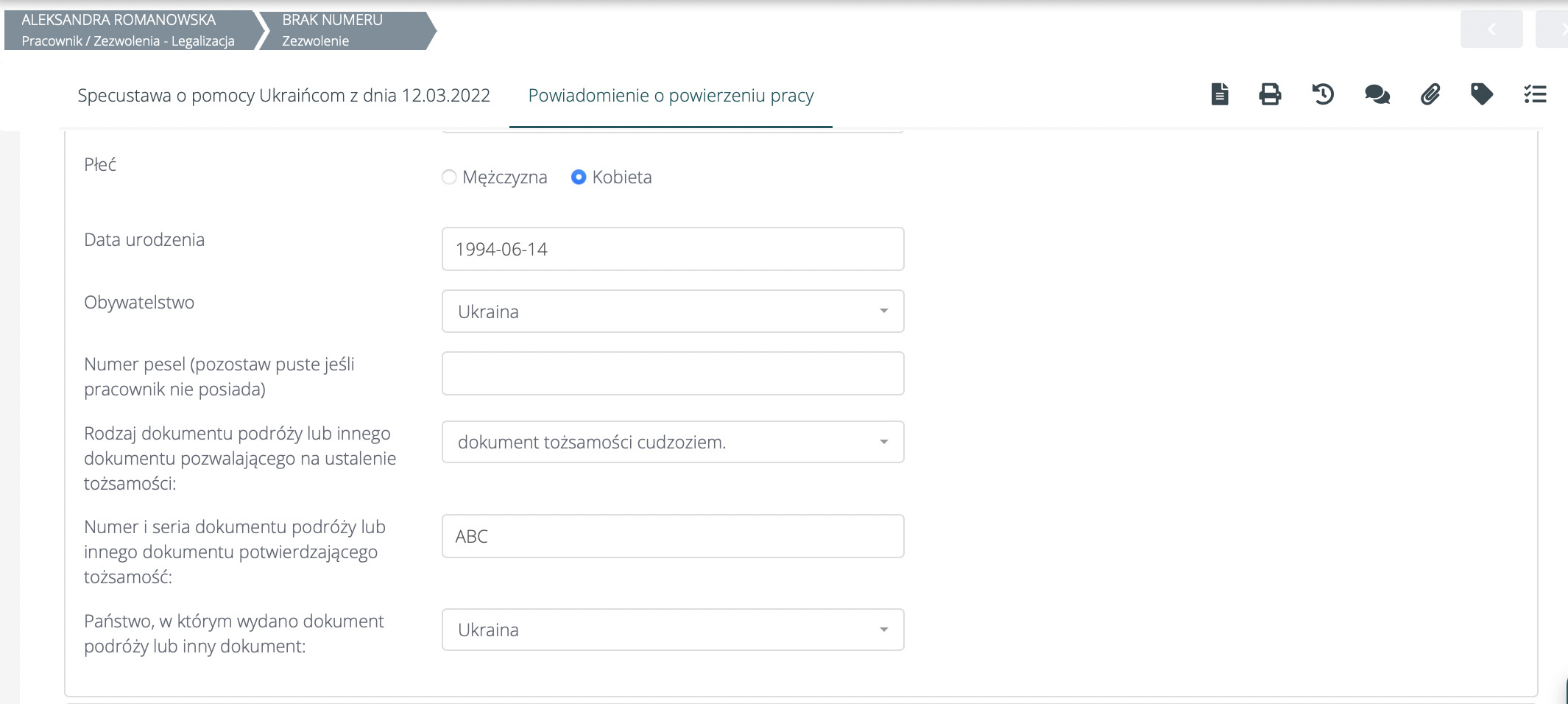 Po uzupełnieniu, dane naniosą się na dokument „Powiadomienie o powierzeniu pracy obywatelowi Ukrainy". Jeżeli dokumentów jest kilka, to system zaciągnie ten, który jest ważny (jeżeli cudzoziemiec posiada paszport – nawet nieaktywny, system zawsze zaciągnie paszport), np: