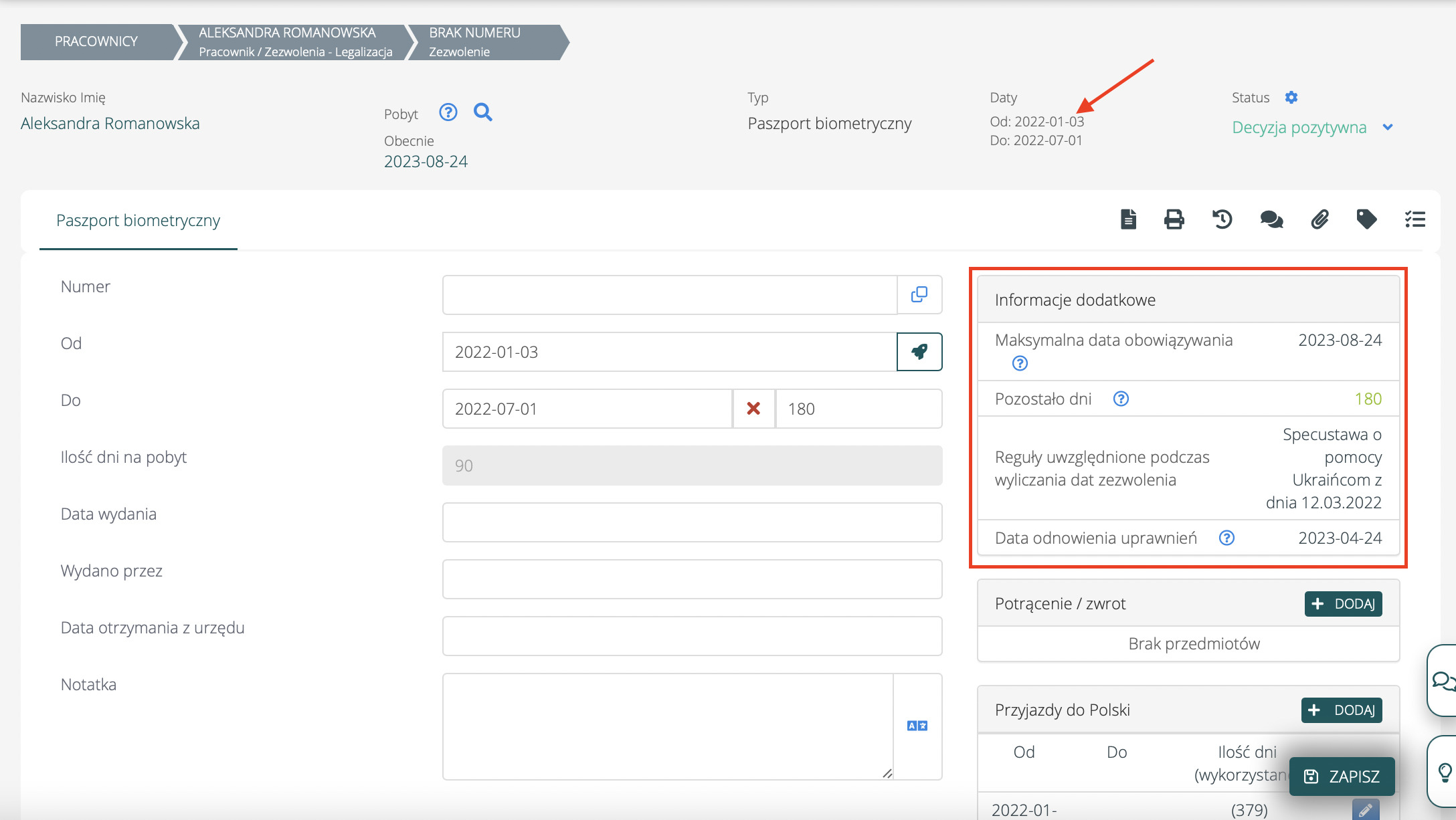 - Przykład: paszport biometryczny, na podstawie którego ruch bezwizowy kończy się po 24.02.2022 i legalny pobyt przedłużany jest o 18 miesięcy – do 24.08.2023 r: