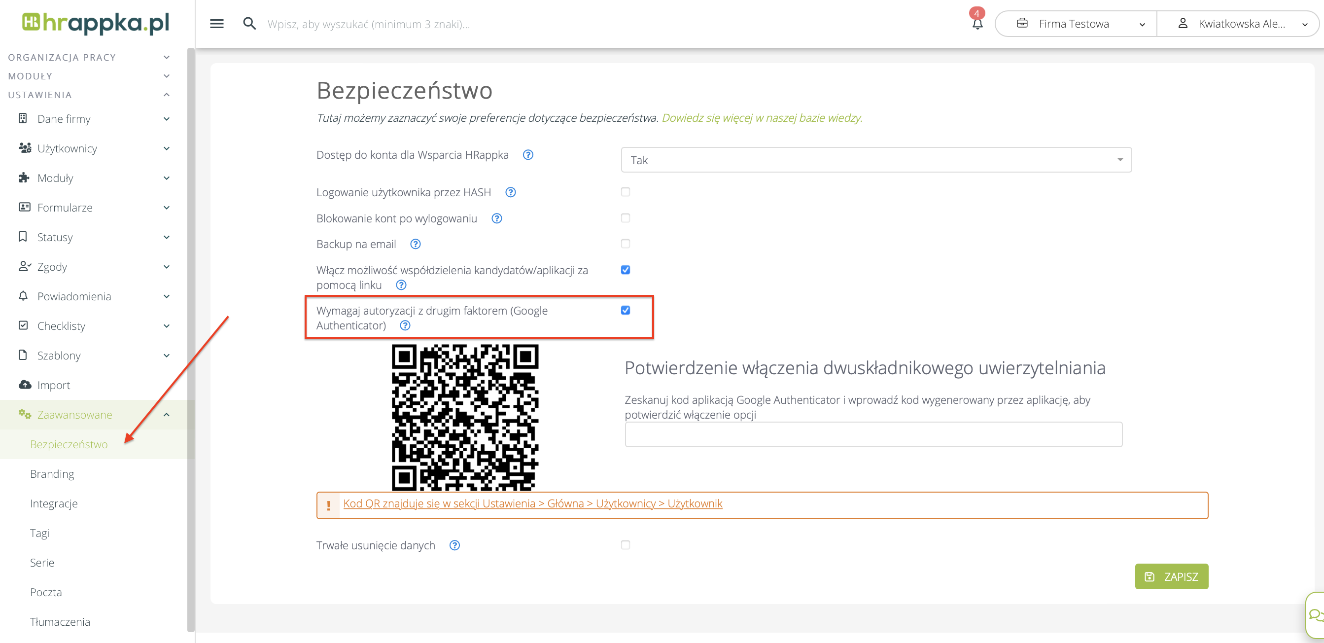 Aby włączyć możliwość logowania dwuetapowego w HRappce, należy przejść w Ustawienia > Zaawansowane > Bezpieczeństwo, a następnie zaznaczyć checkbox przy “Wymagaj autoryzacji z drugim faktorem (Google Authenticator)“.