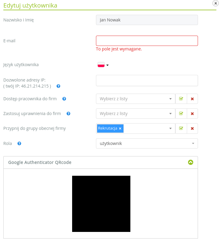 Sekcja Google Authenticator nie jest widoczna podczas edycji pracownika? Prawdopodobnie opcja dwuskładnikowego logowania nie jest włączona w Ustawienia > Zaawansowane > Bezpieczeństwo. Wróć do sekcji „Konfiguracja globalna logowania dwuetapowego” i postępuj zgodnie z instrukcją.