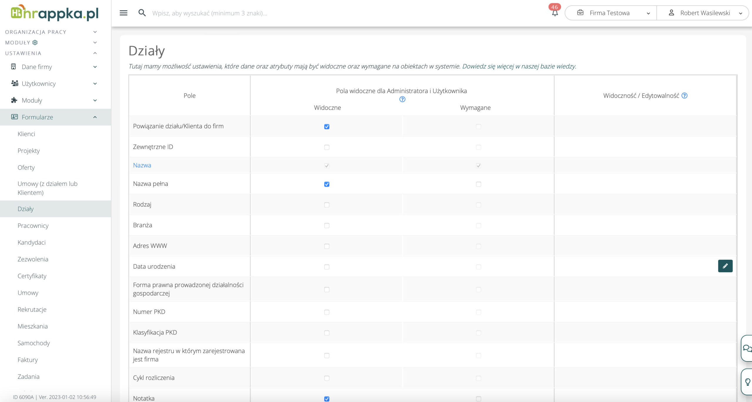 Początkowa konfiguracja modułu Działy (formularze, statusy) wygląda analogicznie, jak modułu Klientów (CRM > Lista Klientów). Istnieje możliwość zmiany konfiguracji działów aby dopasować je do ich specyfiki:
