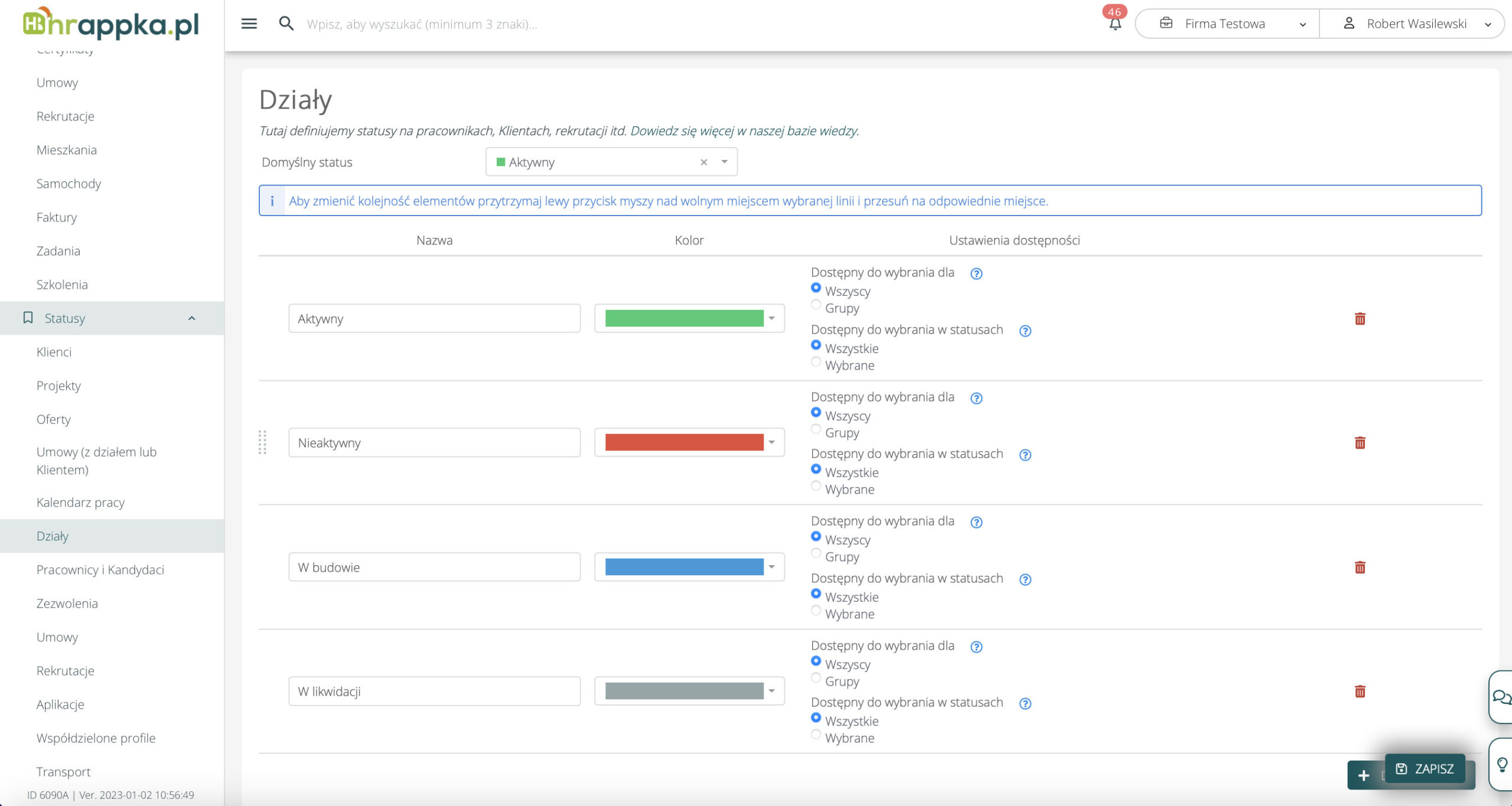 - W Ustawienia > Statusy > Działy możemy konfigurować osobne statusy dla działów:
