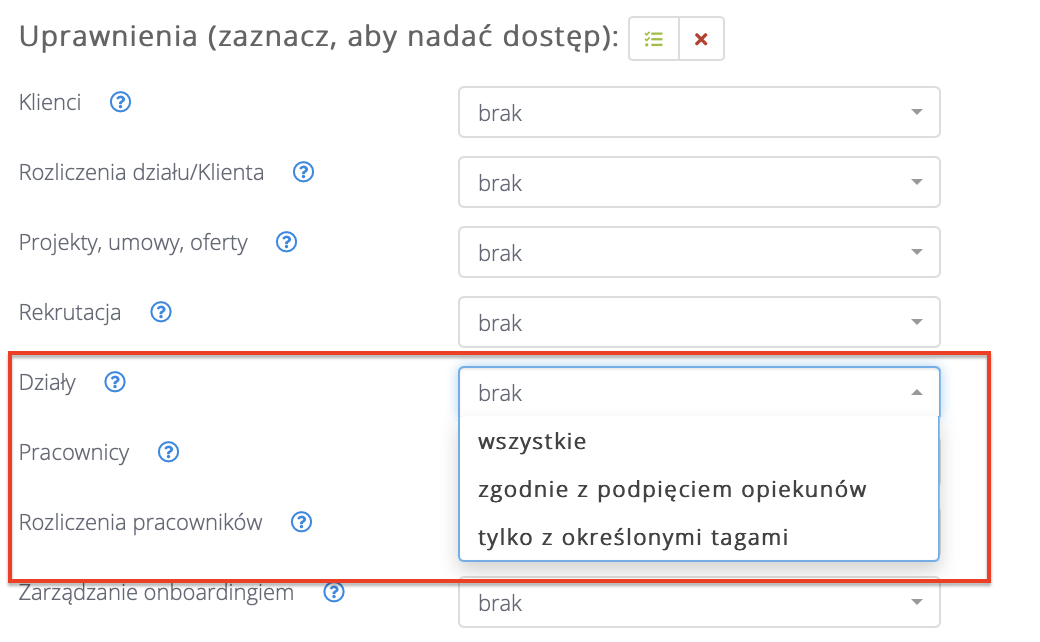 Uprawnienia dla modułu Działy są analogiczne, jak na listach Klientów. Użytkownicy, którzy mieli uprawnienie do Klientów, mają analogiczne uprawnienie do Działów. Uprawnienia można sprawdzić / edytować w Ustawienia> Użytkownicy > Użytkownicy > Konkretny użytkownik, w sekcji Pracownicy w polu Działy.