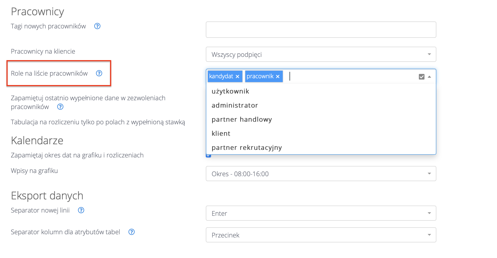 Konfiguracja, ról osób, które mają się domyślnie wyświetlać na liście pracowników jest dostępna w Ustawieniach użytkownika w polu „Role na liście pracowników" (każdy użytkownik może to ustawić na swoim koncie):