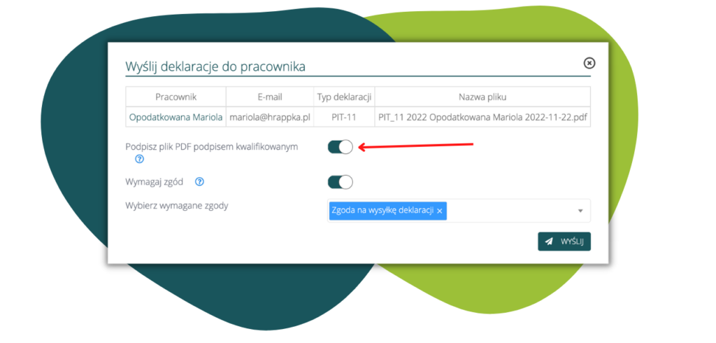 Podczas wysyłki deklaracji do pracowników (Deklaracje > PIT Pracowników > Do wysłania do pracowników > opcje Wyślij do pracowników / Wyślij masowo do pracowników) pojawi się switch, który umożliwi podpisanie deklaracji elektronicznym podpisem kwalifikowanym.