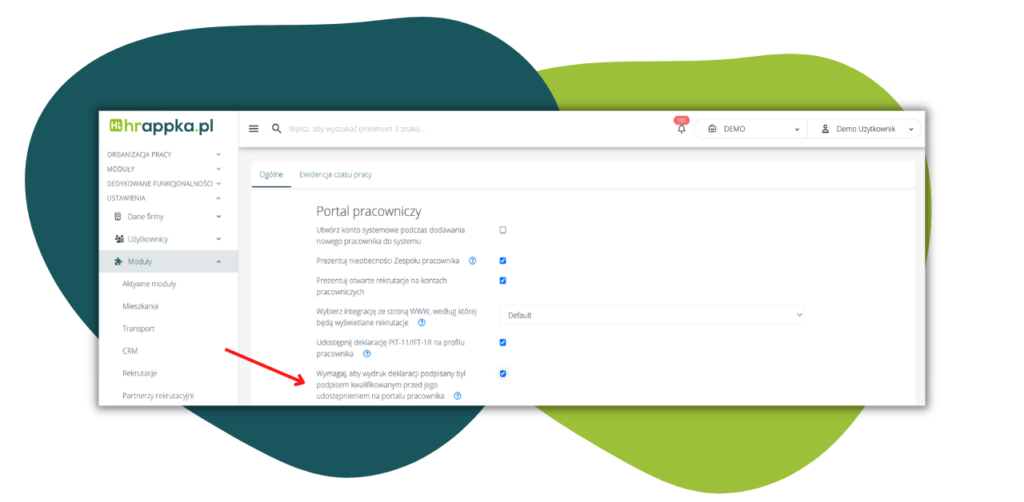 Nowa opcja „Wymagaj, aby wydruk deklaracji podpisany był podpisem kwalifikowanym przed jego udostępnieniem na portalu pracownika” dostępna jest w Ustawieniach > Moduły > Pracownicy w sekcji „Portal pracowniczy”. Domyślnie opcja ta jest wyłączona.