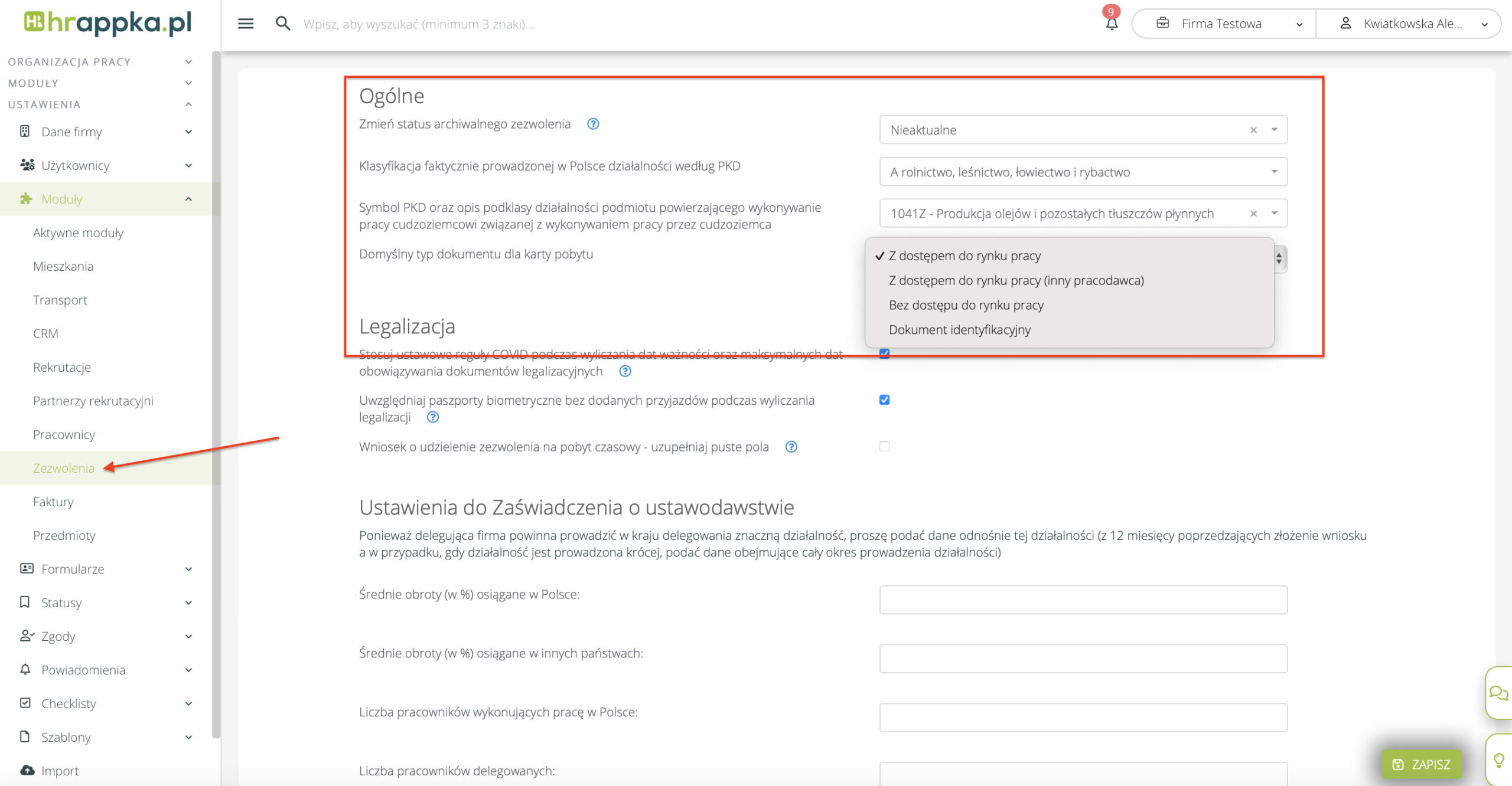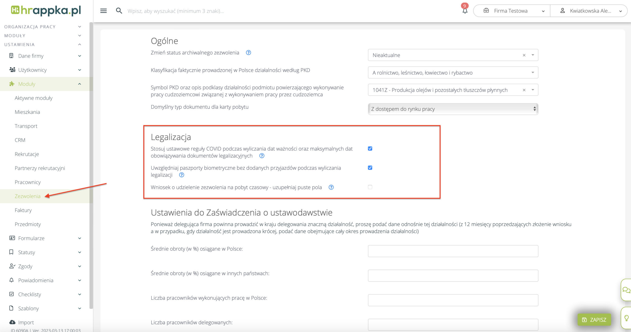 W celu usprawnienia w konfiguracji dokumentów legalizacyjnych w Ustawienia > Moduły > Zezwolenia, dodana została nowa sekcja „Legalizacja”: