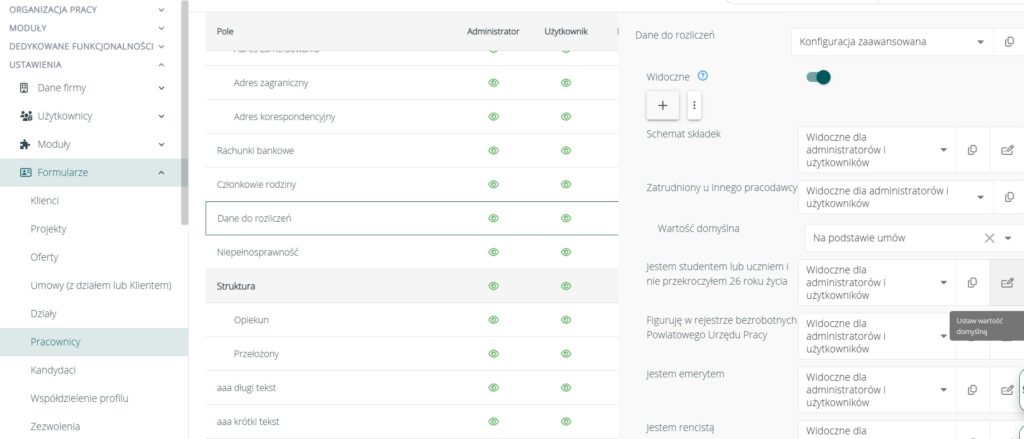 • Nowe pola z możliwością ustawienia wartości domyślnej: