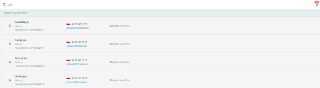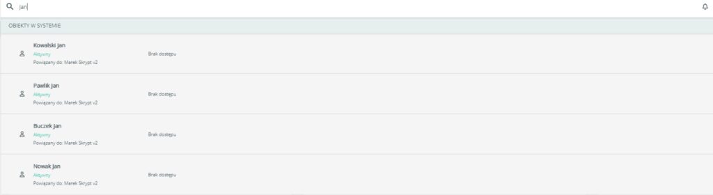 Zmodyfikowano wyszukiwarkę główną tak, aby mogła prezentować dane ze wszystkich firm powiązanych w ramach subskrypcji. Jeżeli użytkownik nie ma dostępu do danej encji, wyświetlana będzie jedynie nazwa, status, opiekun (jeśli jest) oraz komunikat „Brak dostępu”.