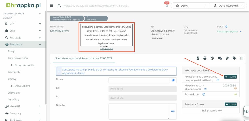- Jeżeli pracownikowi z obywatelstwem ukraińskim dodamy (lub posiada dodane) zezwolenie o typie „Specustawa o pomocy Ukraińcom z dnia 12.03.2022” to system oznaczy pracę jako legalną dopiero po dodaniu Powiadomienia o powierzeniu pracy obywatelowi Ukrainy ze statusem systemowym decyzja pozytywna lub wniosek złożony.