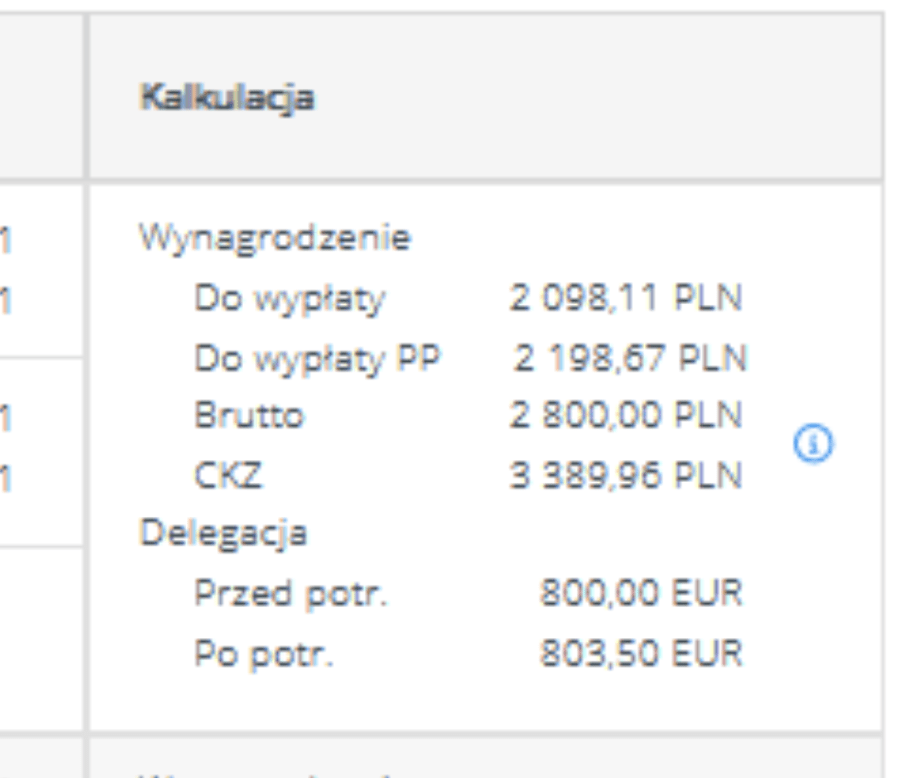 W celu lepszej analizy rozliczenia, gdy na rozliczeniu pracowników występuje element delegacji to w kolumnie „Kalkulacja” osobno pokazujemy elementy wynagrodzenia i osobno delegacji wraz z wartościami przed i po potrąceniach (w przypadku różnych wartości dla tych pól):