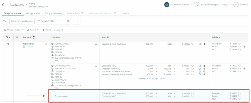 W celu usprawnienia weryfikacji zgodności naliczanych pracownikom wynagrodzeń, na rozliczeniu pracowników, w przypadku rozliczania pracowników z więcej niż jedną umową, system wyświetli indywidualne podsumowanie umów pracownika: