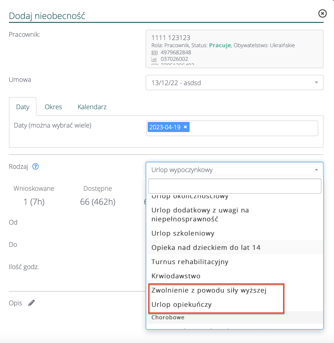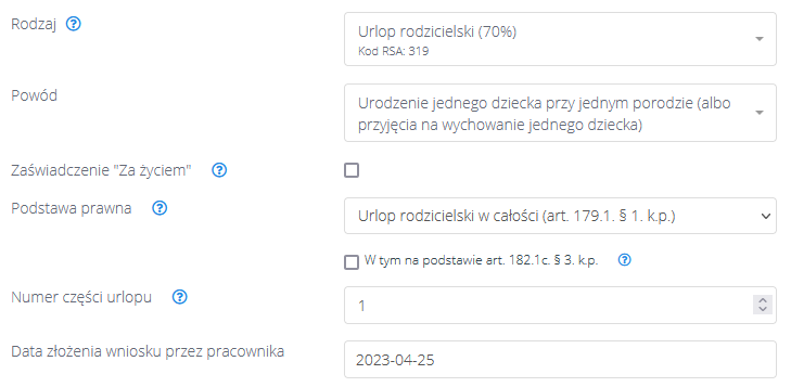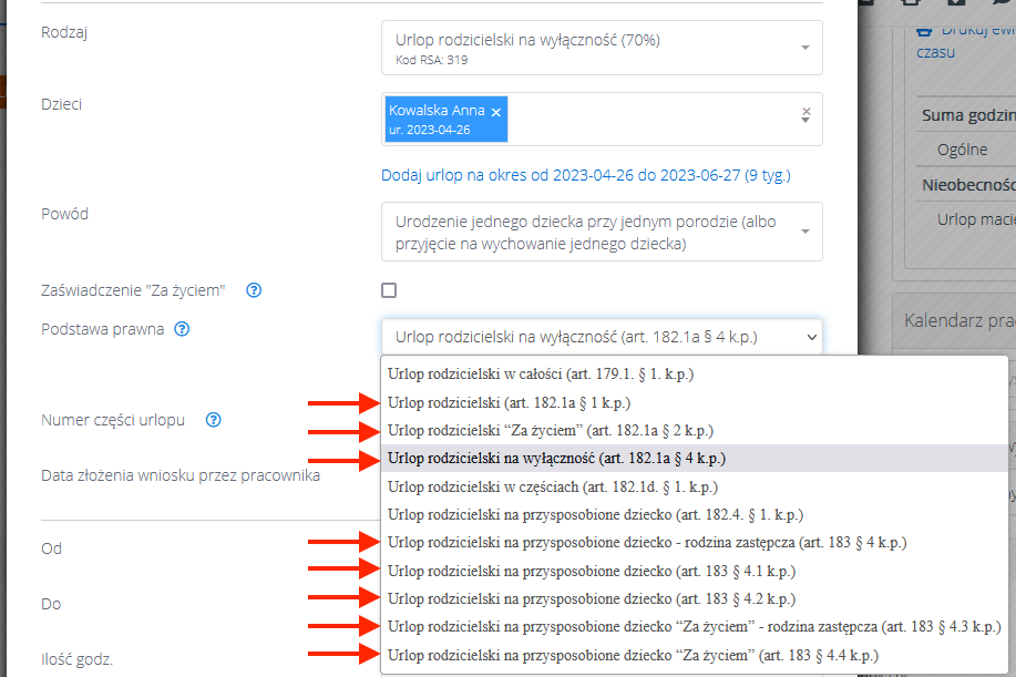 Podczas dodawania nieobecności „Urlop rodzicielski” – każdego typu (np. w  Pracownicy > Lista pracowników > Dany pracownik > Grafik > Dodaj nieobecność > Każdy typ urlopu rodzicielskiego), dodane zostały: