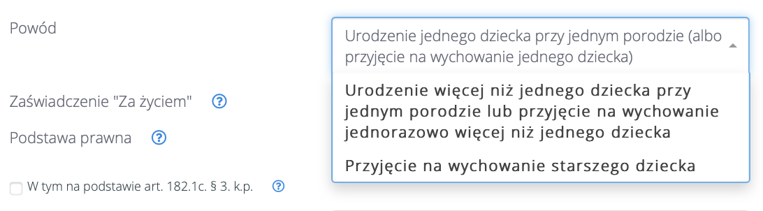 • 67 tygodni – w przypadku wyboru opcji „Urodzenie więcej niż jednego dziecka przy jednym porodzie lub przyjęcie na wychowanie jednorazowo więcej niż jednego dziecka” oraz opcji „Zaświadczenie “Za życiem””