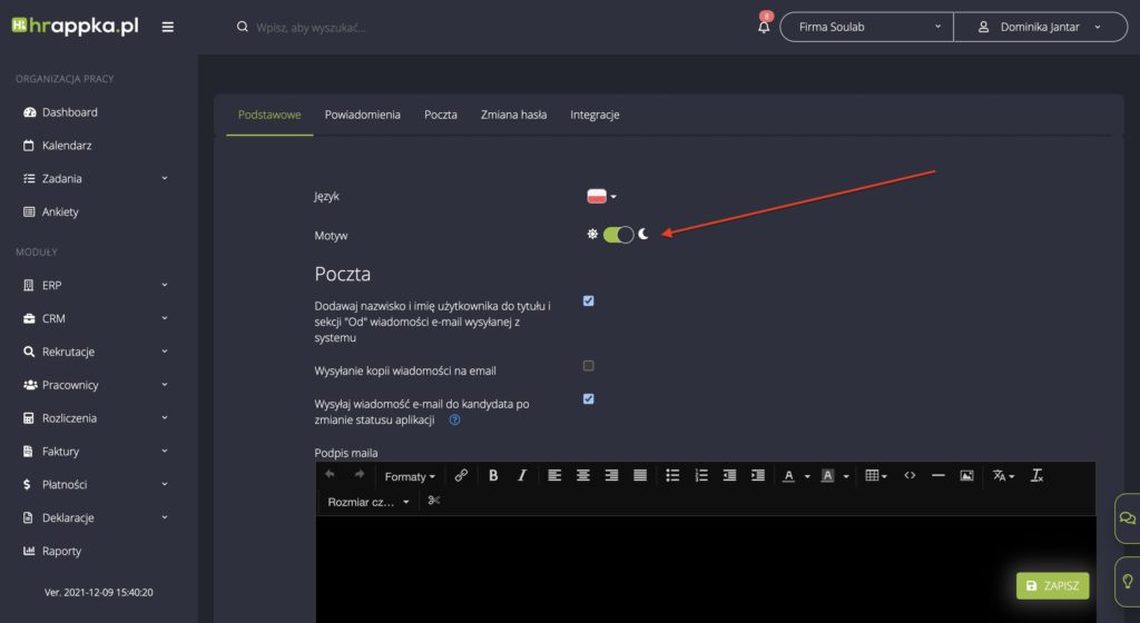 W odpowiedzi na Państwa prośby dodaliśmy możliwość zmiany motywu systemu z jasnego na ciemny. W tym celu należy wejść w Ustawienia użytkownika > Podstawowe > Motyw. Wybór motywu jest indywidualny dla każdego użytkownika systemu.