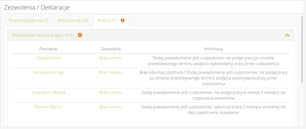 Do powiadomień na dashboardzie „Zezwolenia/deklaracje” dodane zostały nowe powiadomienia dla zezwoleń o pracę typu A:
