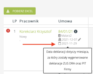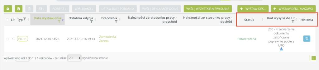 W przypadku, gdy deklaracja została już wysłana, to w kolumnie pojawi się odpowiedni kod wraz z opisem. Jeśli deklaracja nie została jeszcze wysłana to w kolumnie pojawi się “ – „.