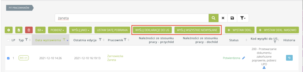 2. W Deklaracje > PIT Pracowników dodane zostały nowe przyciski „Wyślij deklaracje do US” oraz ” Wyślij wszystkie niewysłane”: