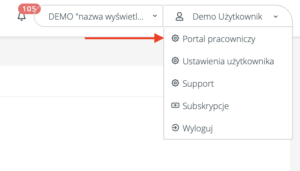 Aby przejść na portal pracowniczy, należy kliknąć w nazwę użytkownika i wybrać „Portal pracowniczy”: