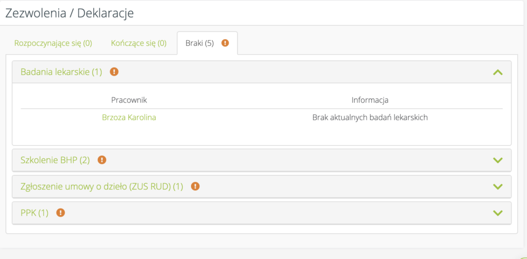 System pobiera aktywne umowy na dany dzień i sprawdza wystawione w bieżącym roku szkolenia BHP i badania lekarskie (ze statusem pozytywne). Sprawdza również, czy wystawiono deklarację ZUS RUD dla aktywnych umów o dzieło wystawionych w bieżącym roku.
