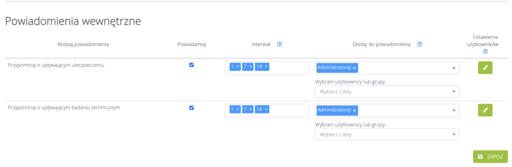 W ERP > Samochody Dodane zostały nowe pola „Data ważności ubezpieczenia” i “Data ważności badania technicznego”. W Ustawienia firmy > Powiadomienia > Samochody – jest dostępna opcja powiadomień dotyczących tych pól (możliwość wybrania Użytkowników i Administratorów)