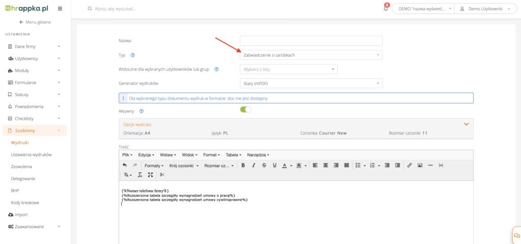 Na wydruku zaświadczenia o zarobkach (Ustawienia firmy > Szablony > Wydruki) dodane zostały 3 nowe znaczniki: Numer telefonu firmy, Rozszerzona tabela szczegóły wynagrodzeń umowy o pracę (rozszerzona tabela bez kolumny brutto umowy, tylko zdrowotne), Rozszerzona tabela szczegóły wynagrodzeń umowy cywilnoprawne (rozszerzona tabela bez kolumny umowa o pracę).