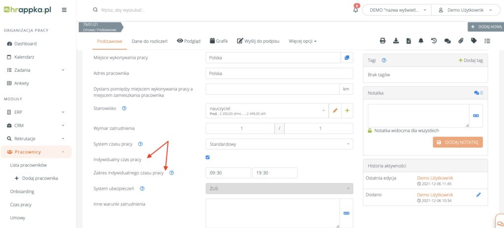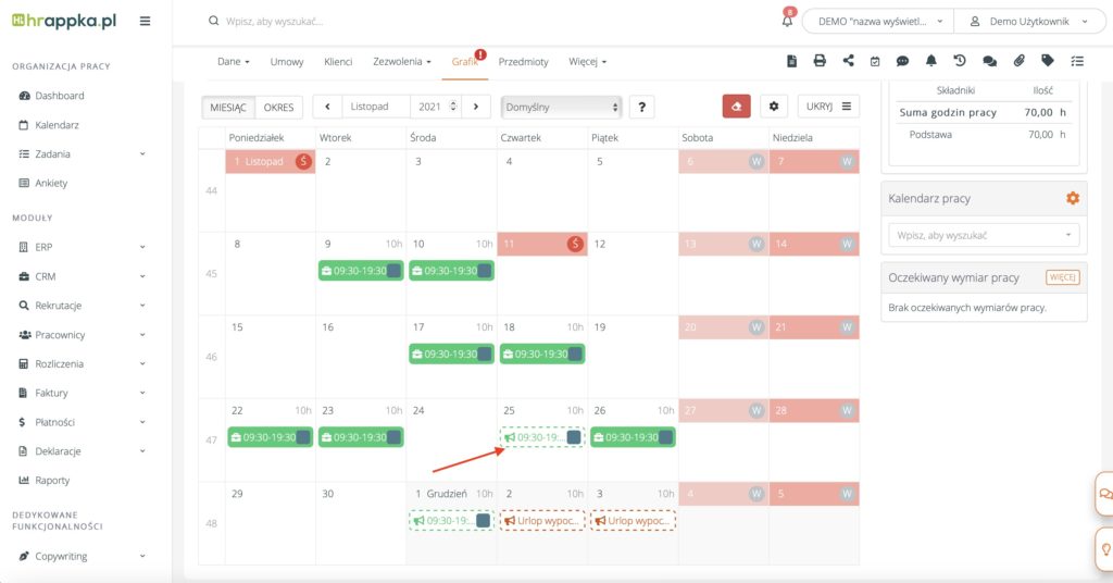 Jeżeli pracownik ma ustalony na umowie indywidualny czas pracy (np. 10-18), to dodając wpisy grafików (Pracownik > Grafik) system podpowiada godziny pracy.