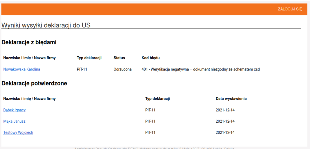 Osoba, która wysyłała deklaracje dostanie powiadomienie e-mailowe, zawierające informacje o potwierdzonych i odrzuconych deklaracjach. Odrzucone deklaracje należy poprawić i podpisać ponownie: